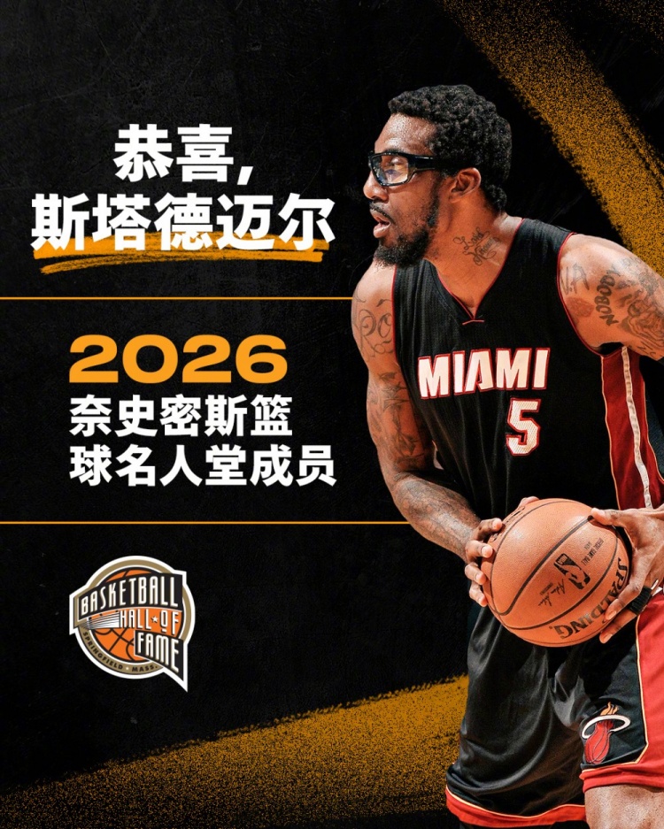 热火官方社媒在第一时间为曾经效力过球队的小斯送上祝福:“恭喜,斯塔德迈尔入选2026篮球名人堂!”